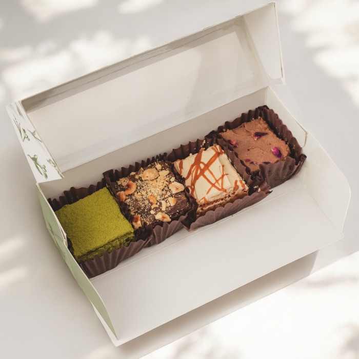 Uma mini seleção de quatro brownies artesanais, com sabores variados, pistácio, caramelo e amendoim, e acabamentos cuidados. Ideal para um presente delicado, uma pausa doce ou para experimentar diferentes combinações.